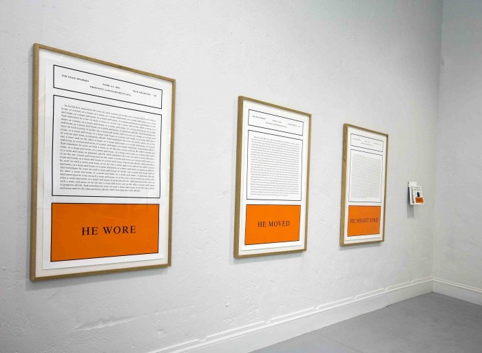 Mr. Watt is the consistent ‘He’ through Thurston’s series. Each of Thurston’s three prints intervenes in one directly quoted list from ‘Watt’. Using shallow parsing – a technique of linguistic analysis – Thurston has reduced the language tokens that represent the possible choices implicated by three simple actions (wearing, finding and moving) to their simple grammatical function (as noun, adjective etc.). The three resultant poems switch the reader’s attention to the slight nuances in Beckett’s connective patterns – the conjunctions, punctuation etc.:
